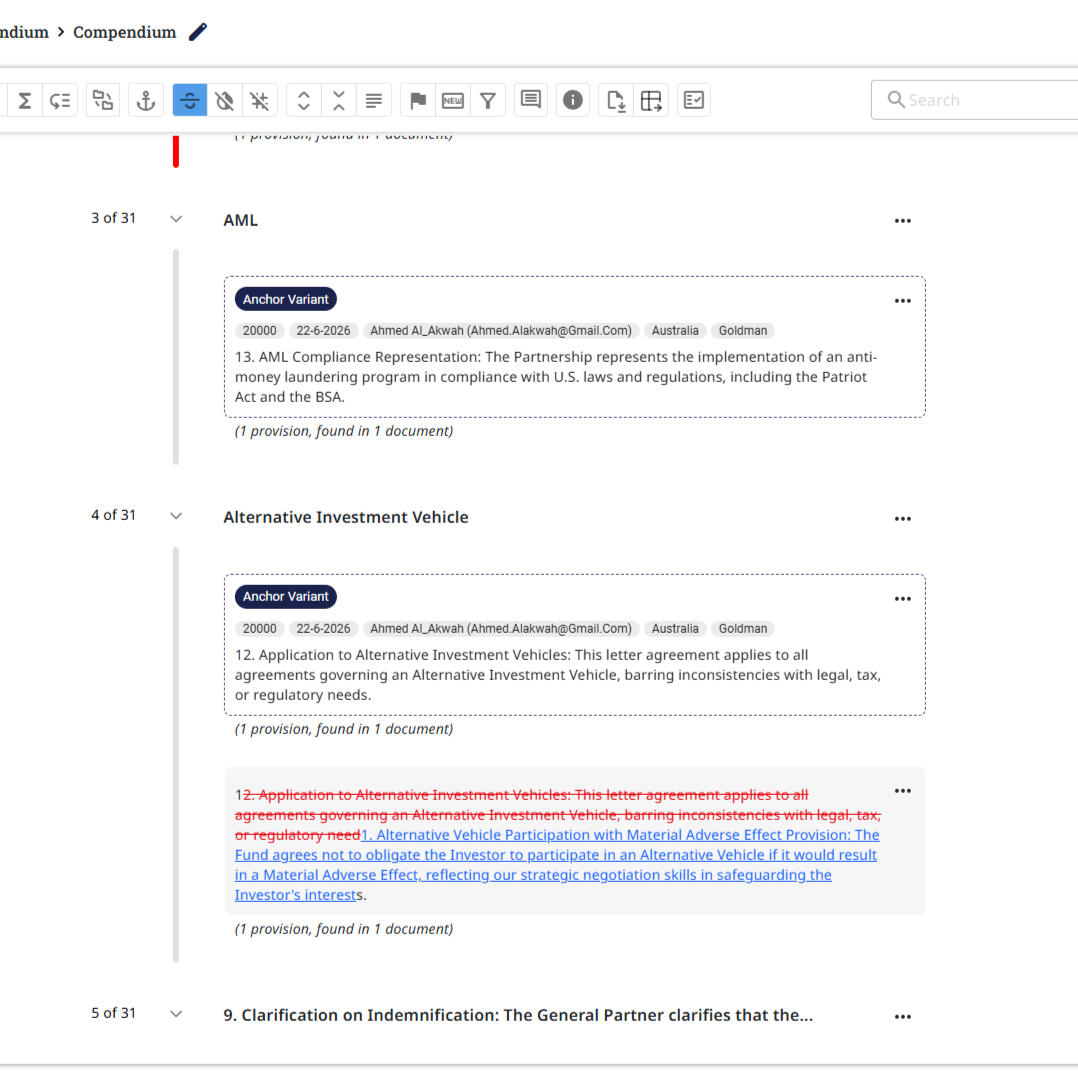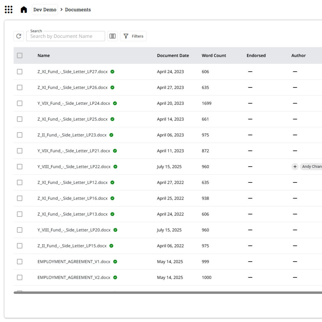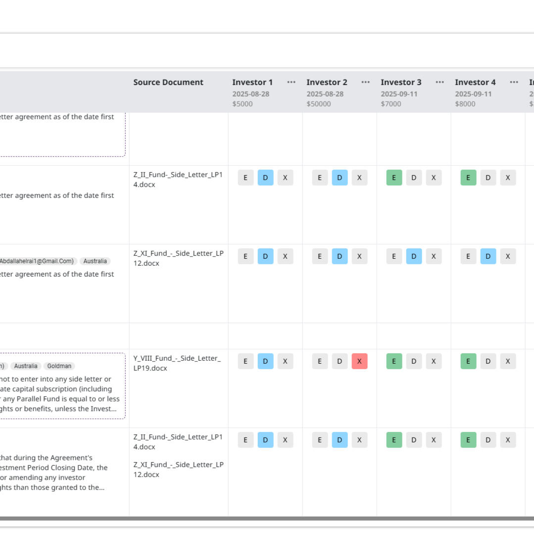Updated master side letters that stay current as terms are renegotiated.Consolidate dozens or hundreds of side letters into a comprehensive master document in minutes. When terms change mid-fundraise, the compendium can be updated easily — no manual rebuilds. Compare language across investors and identify standard vs. custom terms instantly.