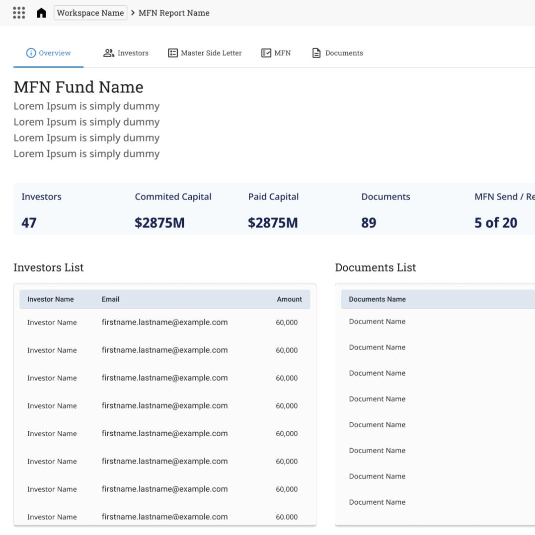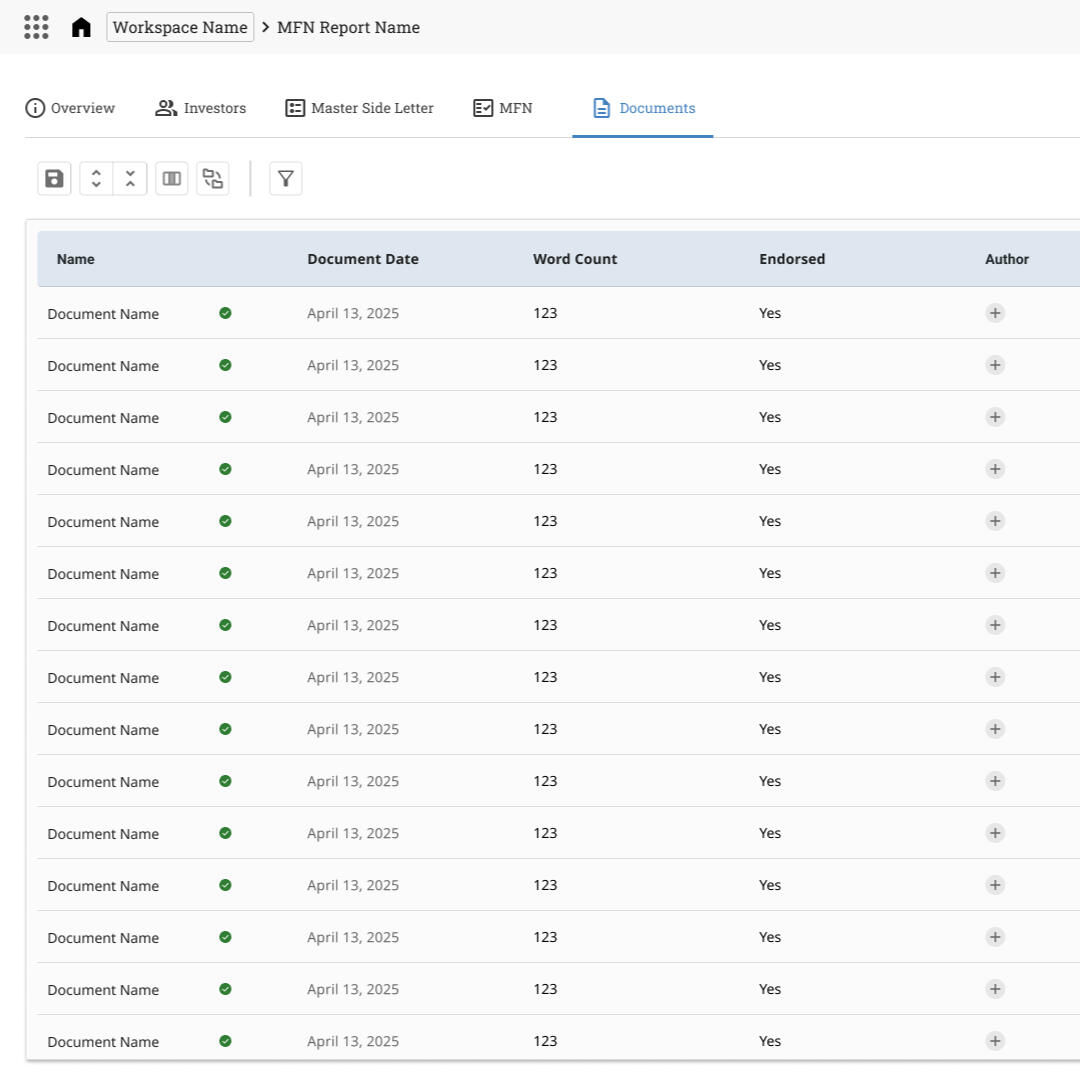 Side letters are ingested once and structured automatically.MFN election forms are generated, distributed, and tracked in one system.Investor responses are reviewed and reconciled in a single table before finalization, replacing manual workflows that typically take weeks.